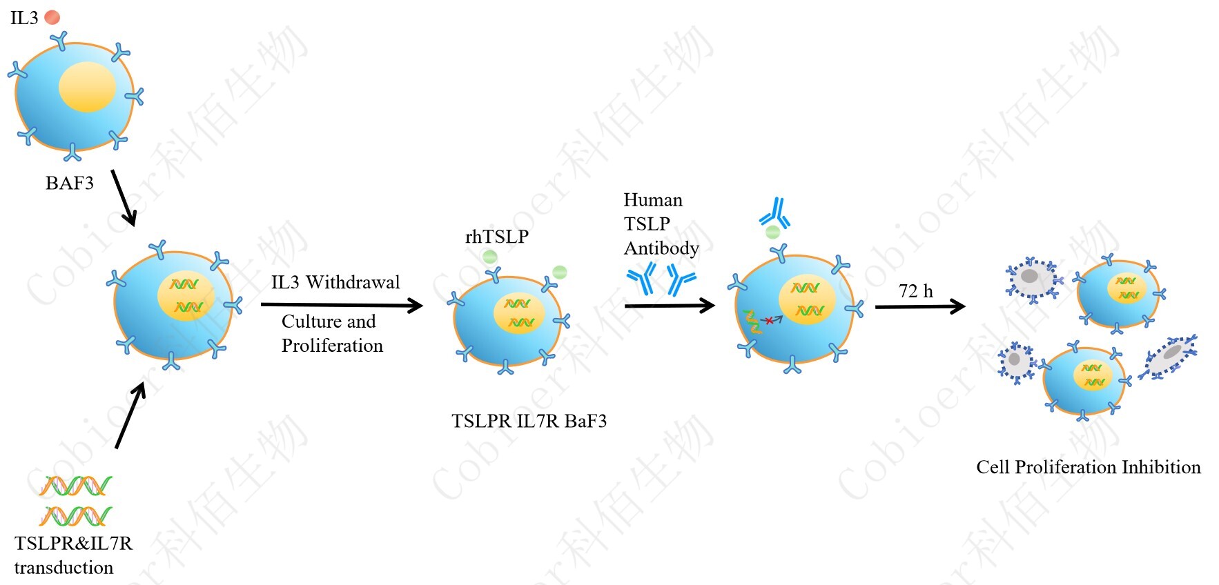 BaF3(小鼠原 B 細(xì)胞)的生長和增殖需要 IL-3 的維持。通過引入各種表達(dá)激酶的基因, 能作為 BaF3 的驅(qū)動基因,讓 BaF3 不再依賴 IL-3 而增殖,進(jìn)而激酶基因成為 BaF3 增殖依賴的驅(qū)動基因,用于評估小分子藥物對激酶的靶向抑制作用,原理及流程見下圖所示。![]() Figure 1. TSLPR IL7R BaF3 細(xì)胞模型原理圖 |