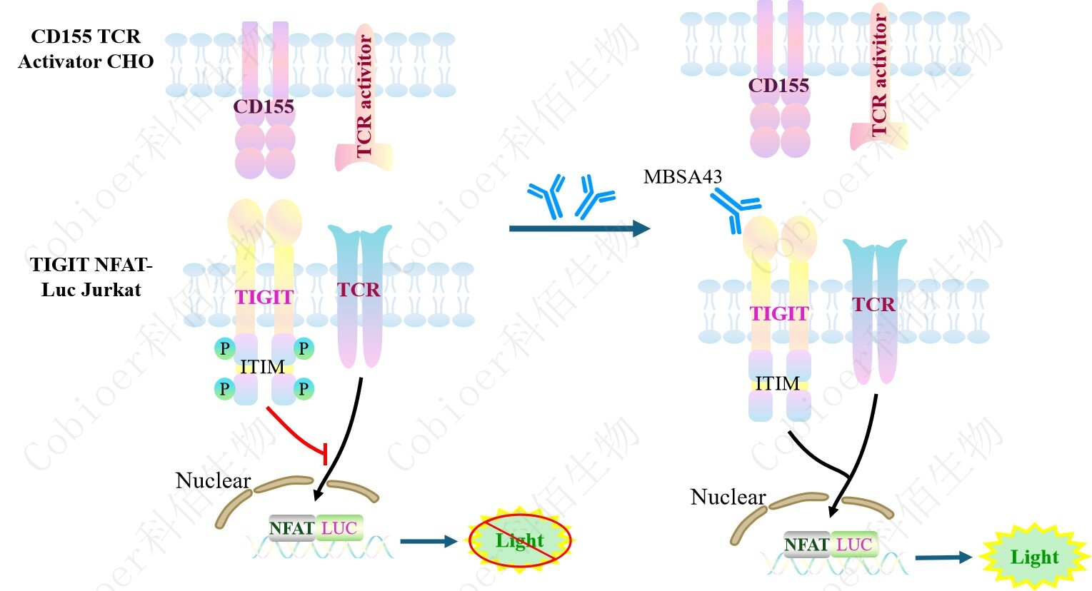 CD155 TCR Activator CHO 細(xì)胞作為 TIGIT NFAT-Luc Jurkat 細(xì)胞的靶細(xì)胞,很好的模 擬了體內(nèi) TIGIT 的信號轉(zhuǎn)導(dǎo)過程,原理見下圖所示。