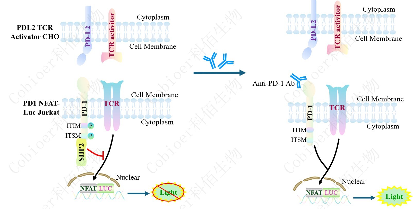PDL2 TCR Activator CHO 細(xì)胞作為 PD1 NFAT-Luc Jurkat 細(xì)胞的靶細(xì)胞,很好的模擬了 體內(nèi) PD1&PDL2 的信號轉(zhuǎn)導(dǎo)過程,原理見下圖所示。![]() Figure 1. PDL2 TCR Activator CHO 細(xì)胞模型原理圖