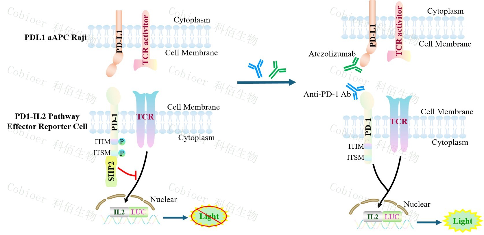 PD1-IL2 Pathway Effector Reporter Cell 報(bào)告基因藥靶模型很好的模擬了體內(nèi) PD1&IL2 的信號(hào)轉(zhuǎn)導(dǎo)過程,原理見下圖所示。![]() Figure 1. PD1-IL2 Pathway Effector Reporter Cell 細(xì)胞模型原理圖 |