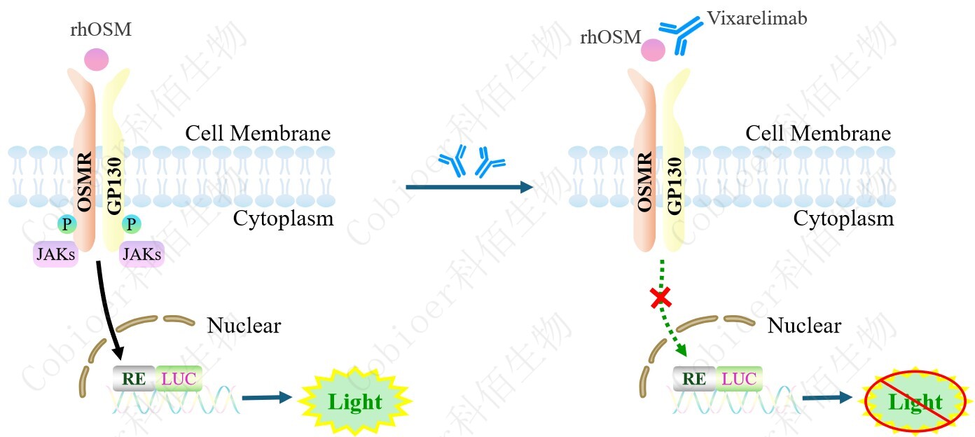 OSMR Effector Reporter Cell 報告基因藥靶模型很好的模擬了體內(nèi) OSMR 的信號轉(zhuǎn)導(dǎo)過程,原理見圖所示。![]() Figure 1. OSMR Effector Reporter Cell 細胞模型原理圖 |