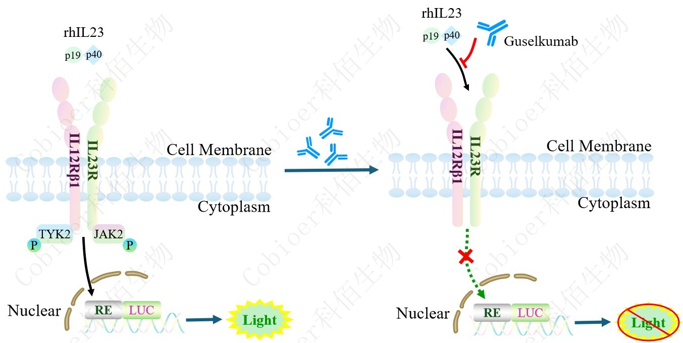 IL23 Effector Reporter Cell 報告基因藥靶模型很好的模擬了體內 IL23 的信號轉導過程, 原理見下圖所示。 ![]() Figure 1. IL23 Effector Reporter Cell 細胞模型原理圖