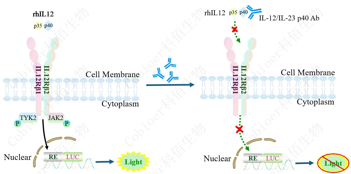 IL12 Effector Reporter Cell 報告基因藥靶模型很好的模擬了體內 IL12 的信號轉導過程, 原理見下圖所示。 ![]() Figure 1. IL12 Effector Reporter Cell 細胞模型原理圖 |