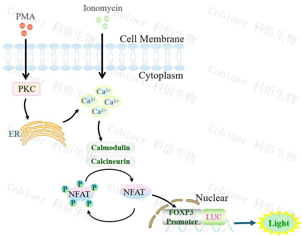 FOXP3 promoter-Luc Jurkat 報告基因細(xì)胞,是由 FOXP3 調(diào)控并表達(dá) Luc 熒光素酶報告基因的 Jurkat 細(xì)胞。PMA 是 DAG(二酯酰甘油)的類似物,可自由的通過 細(xì)胞膜,可用于測定 CD3/CD28 介導(dǎo)的 T 細(xì)胞活化,原理見下圖所示。