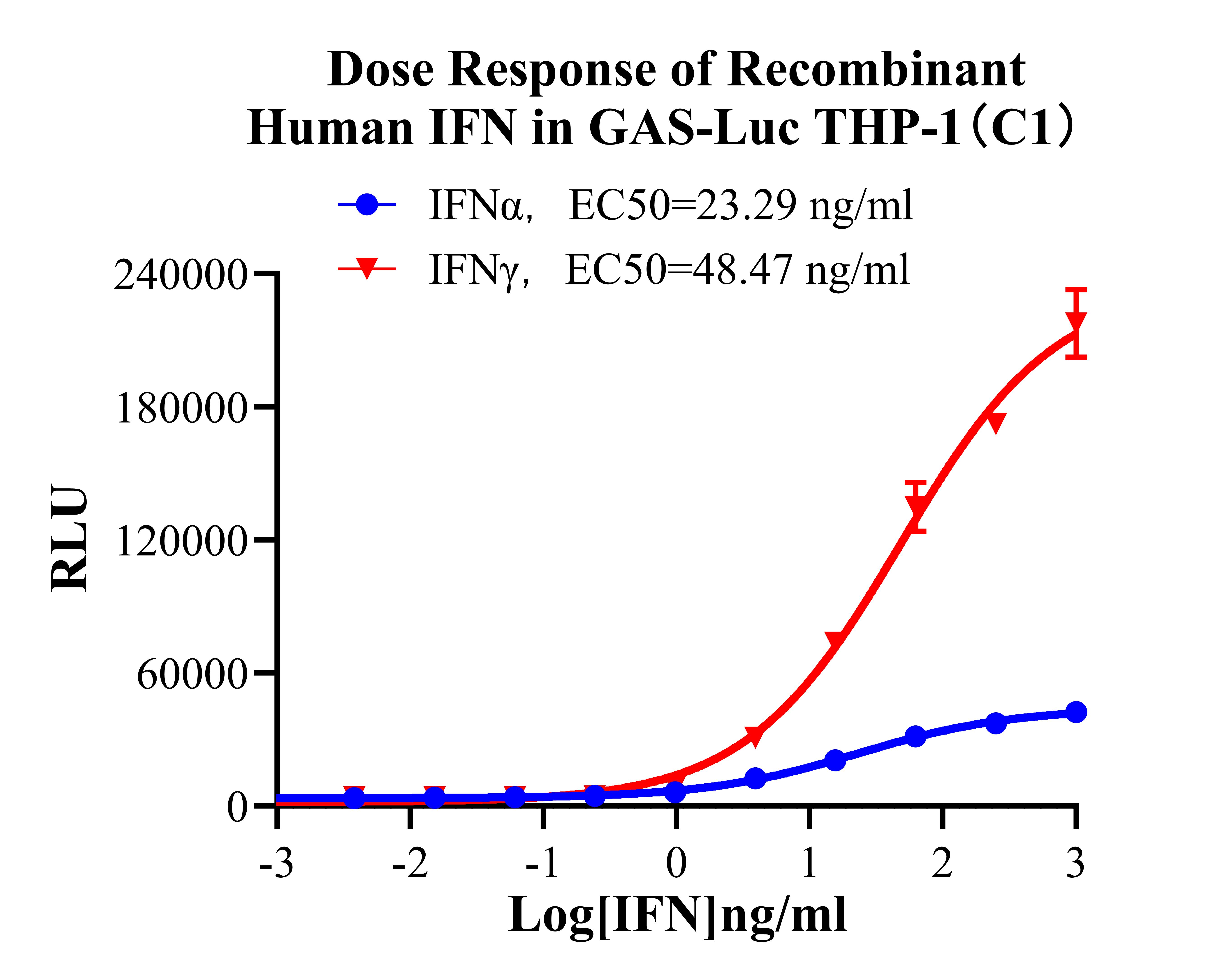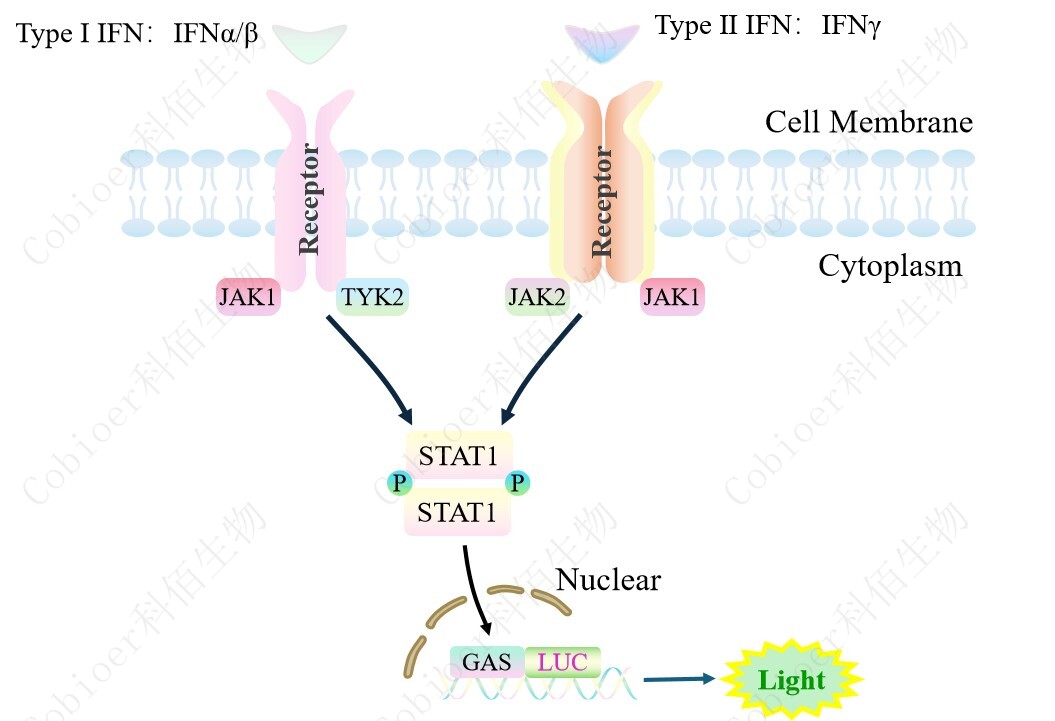 GAS-Luc THP-1 報告基因細胞,是由 GAS 調控并表達 Luc 熒光素酶報告基因的 THP-1 細胞。IFN 與受體結合,激活 GAS 的原理見下圖所示。