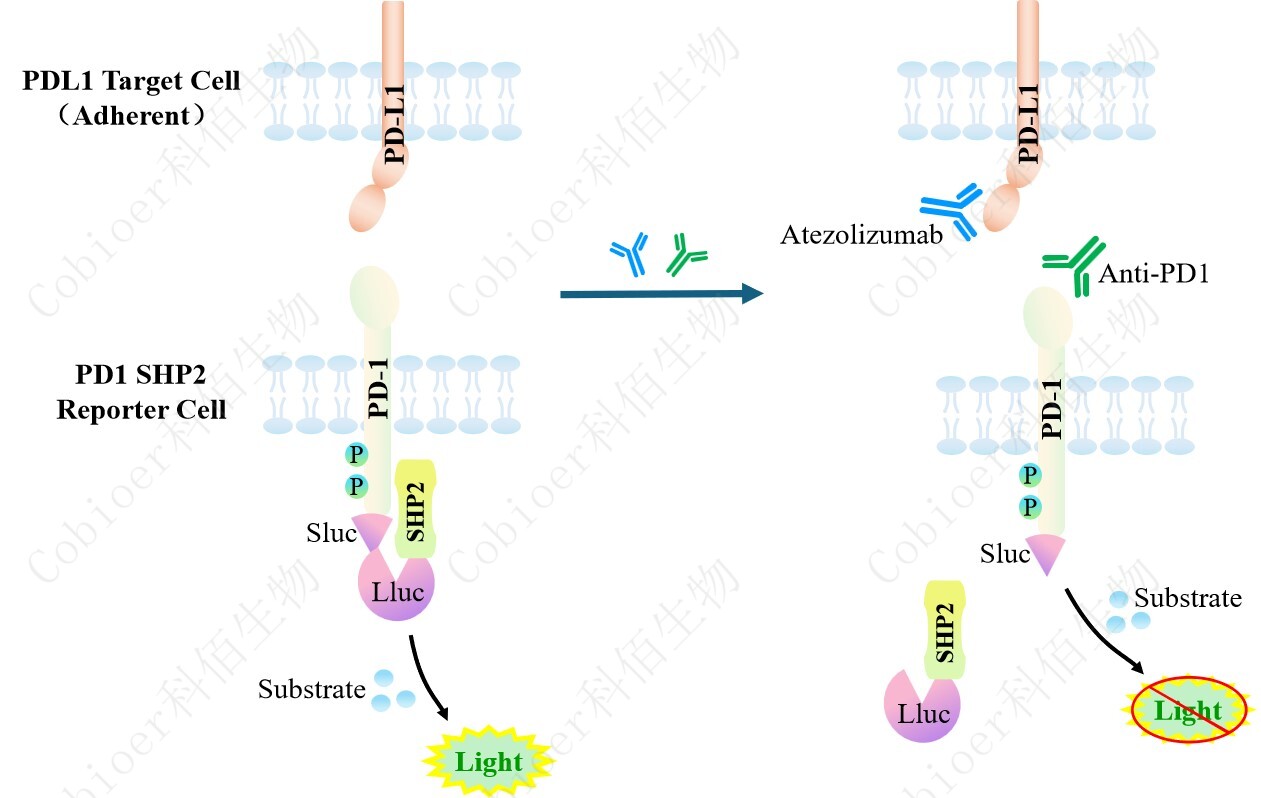 PDL1 Target Cell(Adherent)作為 PD1 SHP2 Reporter Cell 的靶細(xì)胞,藥靶模型很好的 模擬了體內(nèi) PD1&SHP2 的信號(hào)轉(zhuǎn)導(dǎo)過(guò)程,原理見(jiàn)下圖所示。![]() Figure 1. PDL1 Target Cell(Adherent)模型原理圖 |