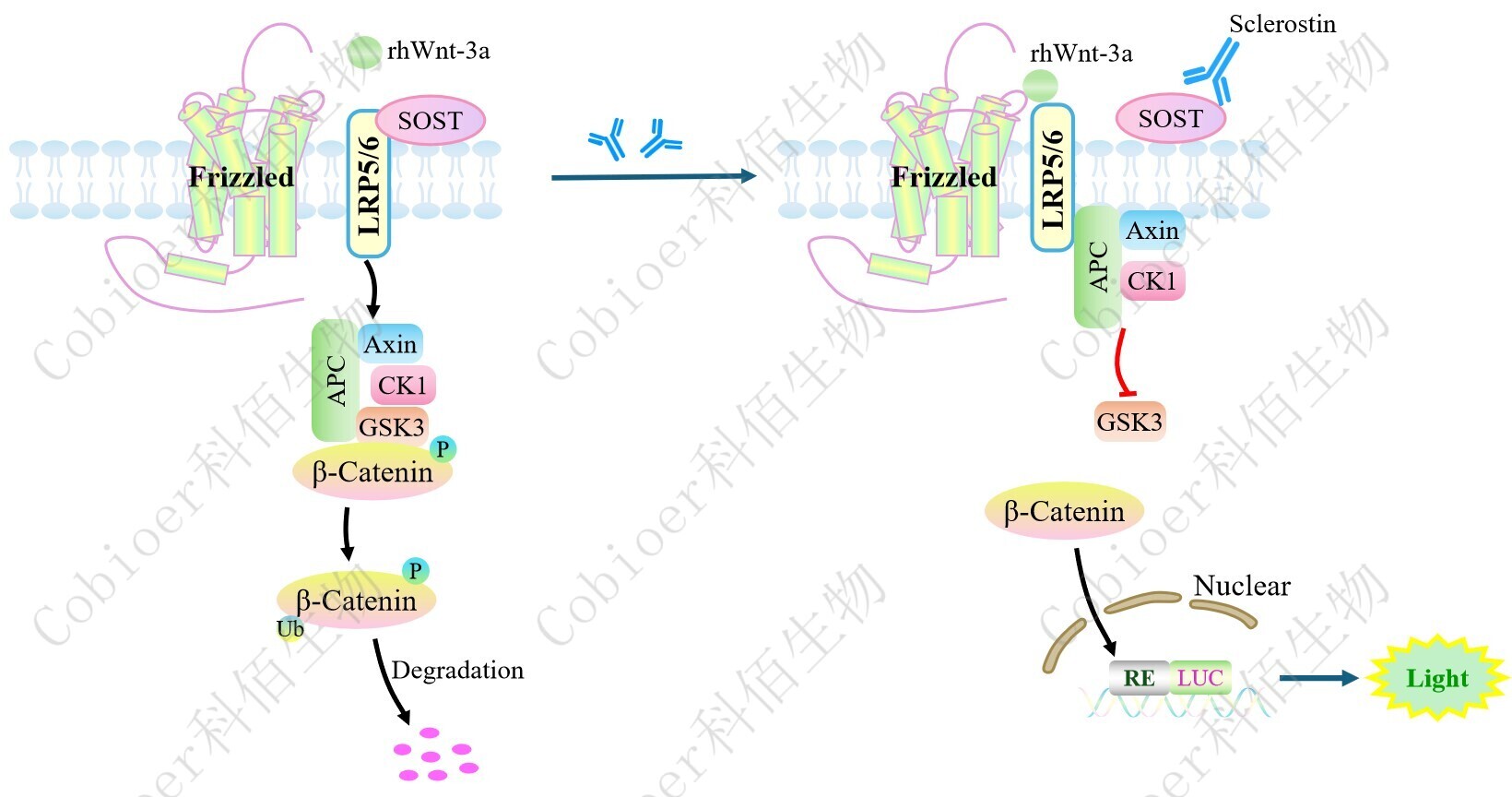 SOST Effector Reporter Cell 報(bào)告基因藥靶模型很好的模擬了體內(nèi) WNT 的信號(hào)轉(zhuǎn)導(dǎo)過程, 原理見下圖所示。![]() Figure 1. SOST Effector Reporter Cell 模型原理圖 |