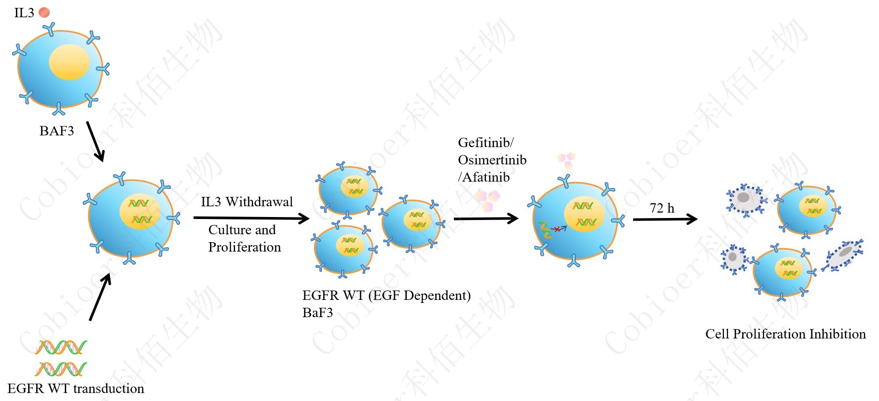 BaF3(小鼠原 B 細胞)的生長和增殖需要 IL-3 的維持。通過引入各種表達激酶的基因, 能作為 BaF3 的驅(qū)動基因,讓 BaF3 不再依賴 IL-3 而增殖,進而激酶基因成為 BaF3 增殖依 賴的驅(qū)動基因,用于評估小分子藥物對激酶的靶向抑制作用,原理及流程見下圖所示。