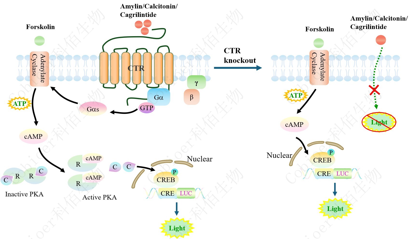 CTR-KO CRE-Luc HEK293 藥靶模型細胞可以用于 CTR 激動劑的選擇性檢測評價,以 確定候選激動劑是否為 CTR 的特異性激動劑,原理見下圖所示。
