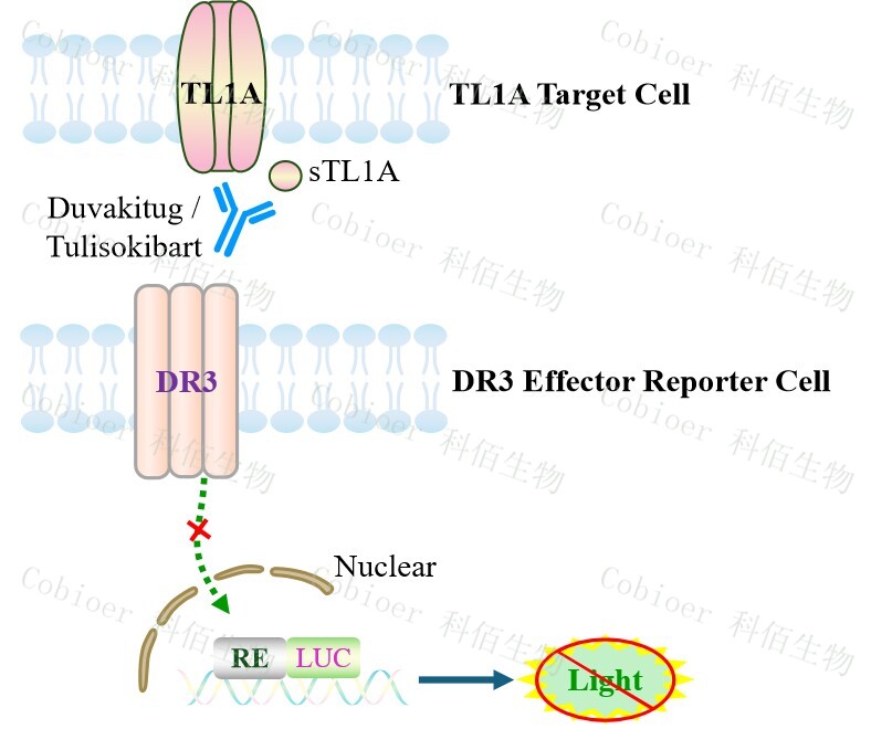 TL1A Target Cell 作為 DR3 Effector Reporter Cell 的靶細胞,很好的模擬了體內 DR3 的 信號轉導過程,原理見下圖所示。
