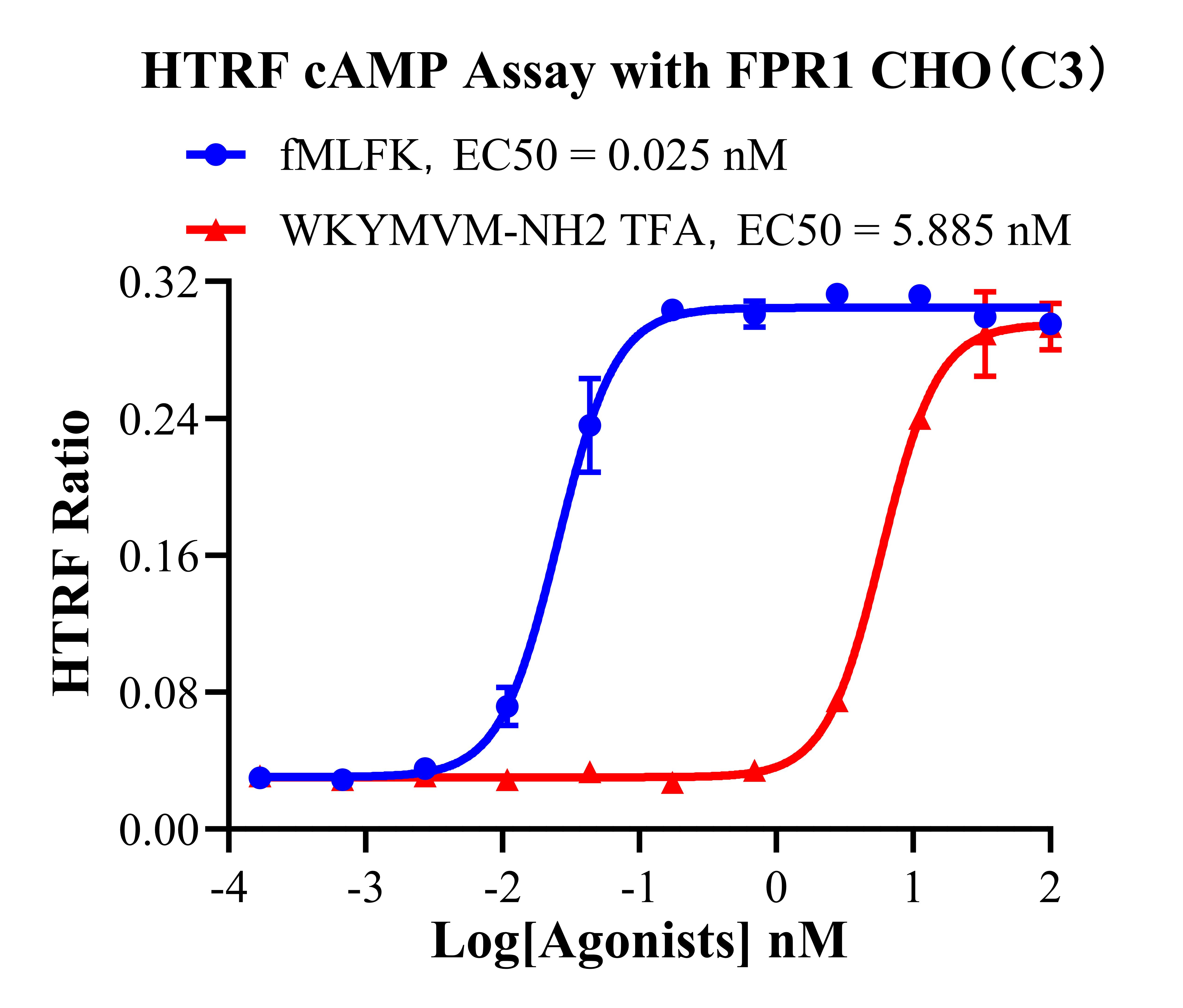 cAMP 在 G 蛋白偶聯(lián)受體(GPCR)信號轉(zhuǎn)導(dǎo)中是一種關(guān)鍵的第二信使。當(dāng)配體結(jié)合 到 GPCR,構(gòu)象發(fā)生變化,激活受體接著激活 G 蛋白,Gi 的激活導(dǎo)致腺苷酸環(huán)化酶調(diào)控 cAMP 的下調(diào)。FPR1 CHO 藥靶模型很好的模擬了體內(nèi) FPR1 的信號轉(zhuǎn)導(dǎo)過程,原理見下圖 所示。