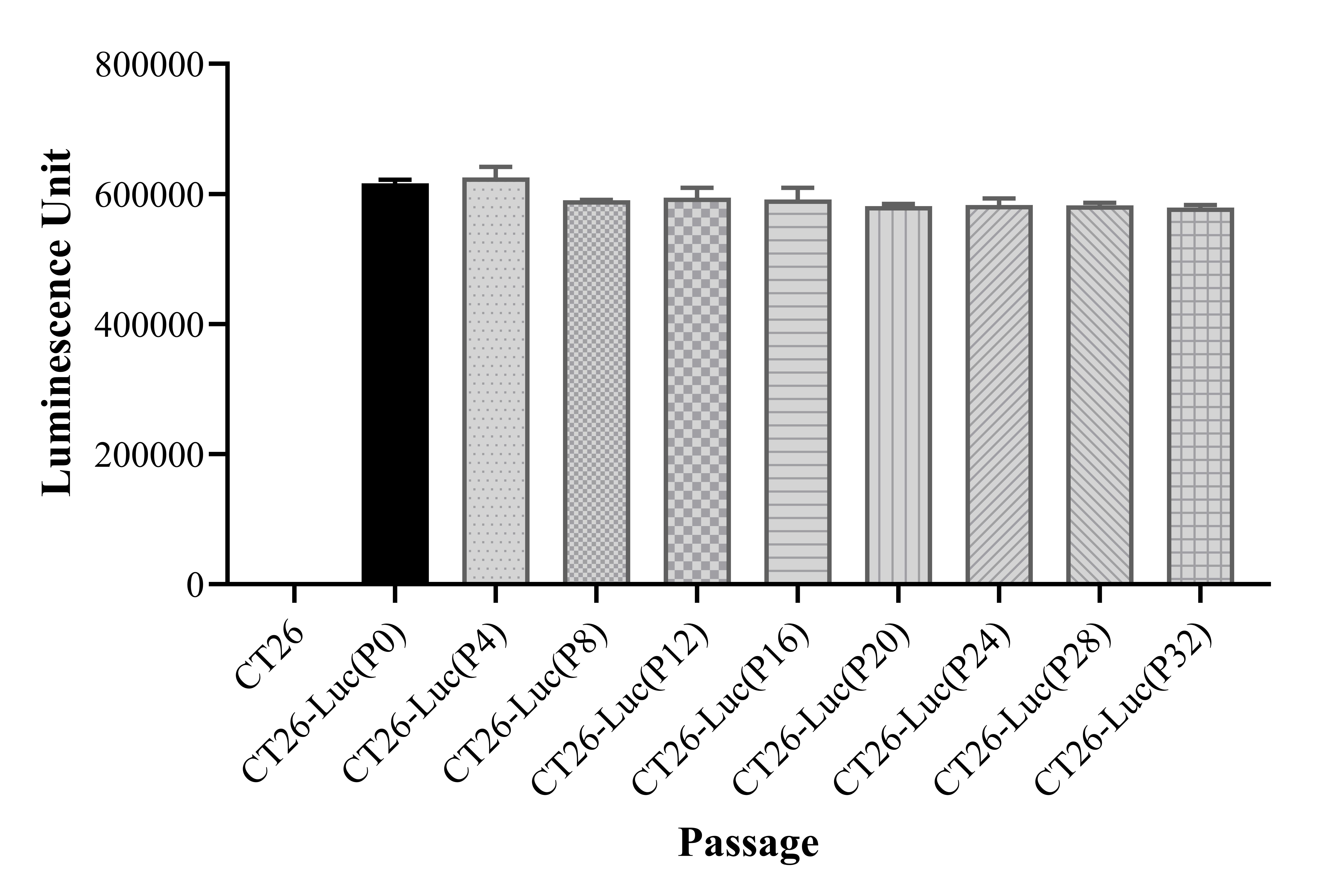 Figure 1. Stablity test results. CT26-Luc showed at least 32 passage stability with similar luminescence unit. |