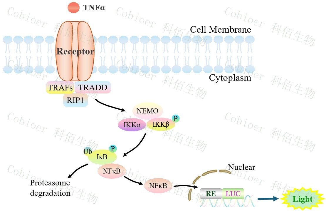 NFκB-Luc K562 報(bào)告基因細(xì)胞,是由 NFκB 調(diào)控并表達(dá) Luc 熒光素酶報(bào) 告基因的 K562 細(xì)胞。TNFα與受體結(jié)合,激活 NF-κB 的原理見下圖所示。