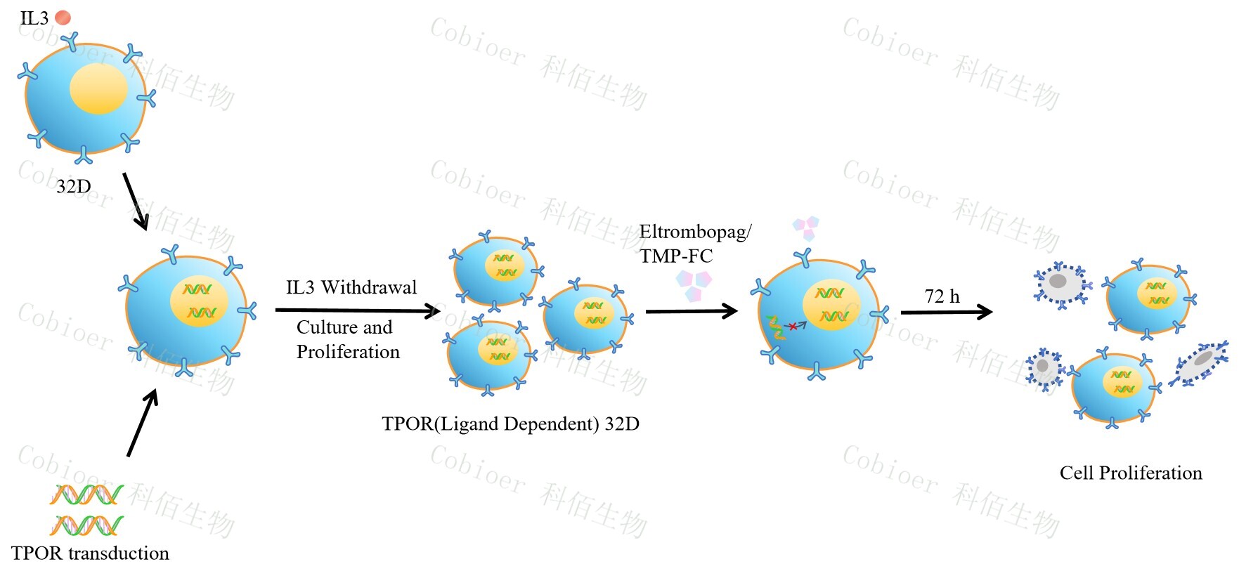 32D(小鼠原 B 細(xì)胞)的生長(zhǎng)和增殖需要 IL-3 的維持。通過(guò)引入各種表達(dá)激酶的基因, 能作為 32D 的驅(qū)動(dòng)基因,讓 32D 不再依賴 IL-3 而增殖,進(jìn)而激酶基因成為 32D 增殖依賴 的驅(qū)動(dòng)基因,用于評(píng)估小分子藥物對(duì)激酶的靶向抑制作用,原理及流程見(jiàn)下圖所示。 Figure 1. TPOR(Ligand Dependent) 32D 細(xì)胞模型原理圖 |