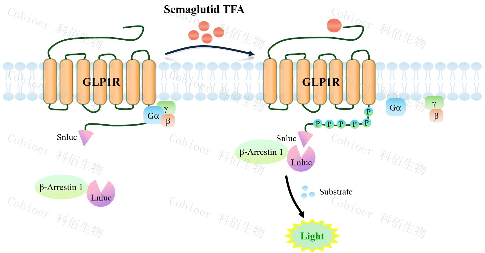 GLP1R β-Arrestin 1 CHO 報告基因藥靶模型很好的模擬了體內(nèi) GLP1R/β-Arrestin 1 的信 號轉(zhuǎn)導(dǎo)過程,原理見下圖所示。當(dāng)缺乏配體刺激時,β-Arrestin 1 不與 GLP1R 結(jié)合,融合β- Arrestin 1 的熒光素酶處于失活構(gòu)象,當(dāng) GLP1R 遭遇配體刺激時,融合熒光素酶報告基因 的β-Arrestin 1 被招募,使熒光素酶報告基因處于激活狀態(tài),加入其底物后發(fā)光信號增強(qiáng)。![]() Figure 1. GLP1R β-Arrestin 1 CHO 細(xì)胞模型原理圖 |
