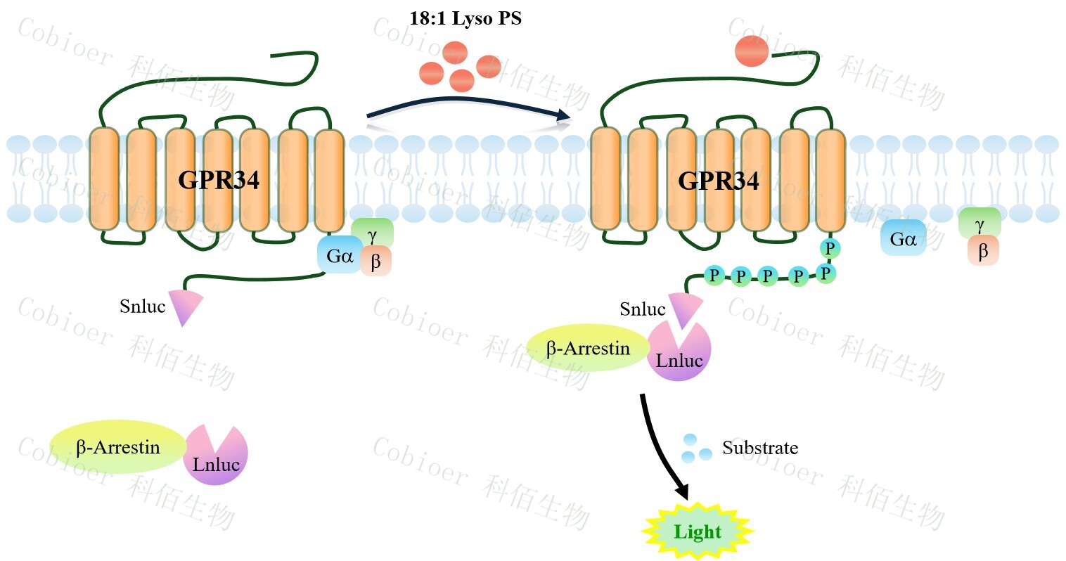 GPR34 β-Arrestin CHO 報告基因藥靶模型很好的模擬了體內(nèi) GPR34/β-Arrestin 的信號 轉(zhuǎn)導(dǎo)過程,原理見下圖所示。當(dāng)缺乏配體刺激時,β-Arrestin 不與 GPR34 結(jié)合,融合β- Arrestin 的熒光素酶處于失活構(gòu)象,當(dāng) GPR34 遭遇配體刺激時,融合熒光素酶報告基因的 β-Arrestin 被招募,使熒光素酶報告基因處于激活狀態(tài),加入其底物后發(fā)光信號增強(qiáng)。![]() Figure 1. GPR34 β-Arrestin CHO 細(xì)胞模型原理圖 |