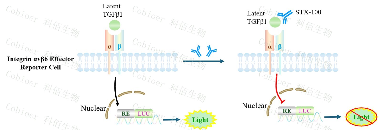 Integrin αvβ6 Effector Reporter Cell 報告基因藥靶模型很好的模擬了體內(nèi)αvβ6 的信號轉(zhuǎn) 導(dǎo)過程,原理見下圖所示。