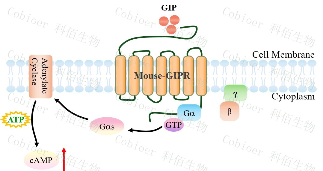 cAMP 在 G 蛋白偶聯(lián)受體(GPCR)信號(hào)轉(zhuǎn)導(dǎo)中是一種關(guān)鍵的第二信使。當(dāng)配體結(jié)合 到 GPCR,構(gòu)象發(fā)生變化,激活受體接著激活 G 蛋白,Gs 的激活導(dǎo)致腺苷酸環(huán)化酶調(diào)控 cAMP 的升高。Mouse GIPR CHO 藥靶模型很好的模擬了體內(nèi) GIPR 的信號(hào)轉(zhuǎn)導(dǎo)過(guò)程,原理 見(jiàn)下圖所示。![]() Figure 1. Mouse GIPR CHO 細(xì)胞模型原理圖