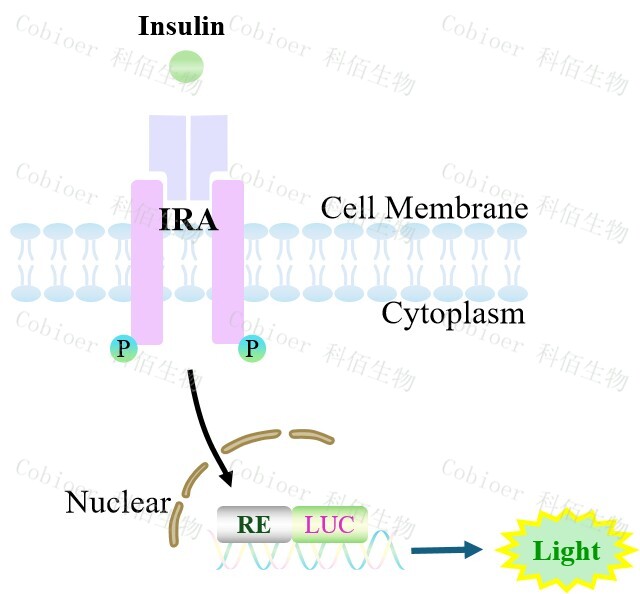 IRA Effector Reporter Cell 報告基因藥靶模型很好的模擬了體內(nèi) Insulin 的信號轉(zhuǎn)導過程, 原理見下圖所示。![]() Figure 1. IRA Effector Reporter Cell 細胞模型原理圖 |