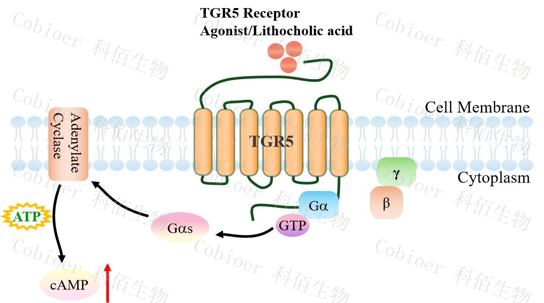 | TGR5 受體是第一個已知的膽汁酸特異性 G 蛋白偶聯(lián)受體,也被稱為膽汁酸受體 1(GPBAR1),屬于 A 類 GPCR 亞家族。該受體由七個跨膜螺旋(TMH1-7)、三個胞外環(huán) (ECL1-3)組成,有助于配體結合,以及三個胞內環(huán)(ICL1-3),參與將信號傳遞給下游 信號分子。TGR5 在體內廣泛存在,在膽囊、回腸、結腸、棕色脂肪組織、脾臟、肺、骨 骼肌、胰島,肝臟中均有表達。有文獻報道 TGR5 被認為是治療代謝性疾?。ㄈ?2 型糖尿 ?。┑臐撛诎悬c。此外,TGR5 還能降低單核細胞中促炎細胞因子的水平,在炎癥過程 (包括結腸炎和動脈粥樣硬化)中發(fā)揮核心作用的病理調節(jié)。 | |