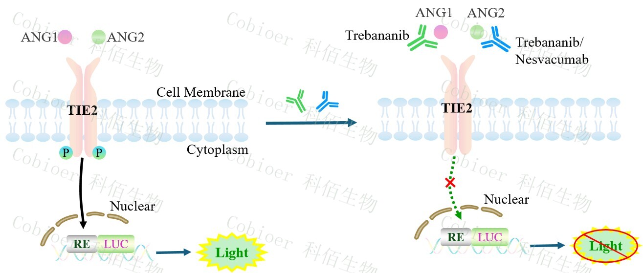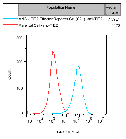 ANG/TIE2 Effector Reporter Cell 報告基因藥靶模型很好的模擬了體內(nèi) ANG/TIE2 的信 號轉(zhuǎn)導(dǎo)過程,原理見下圖所示。![]() Figure 1. ANG/TIE2 Effector Reporter Cell 細(xì)胞模型原理圖