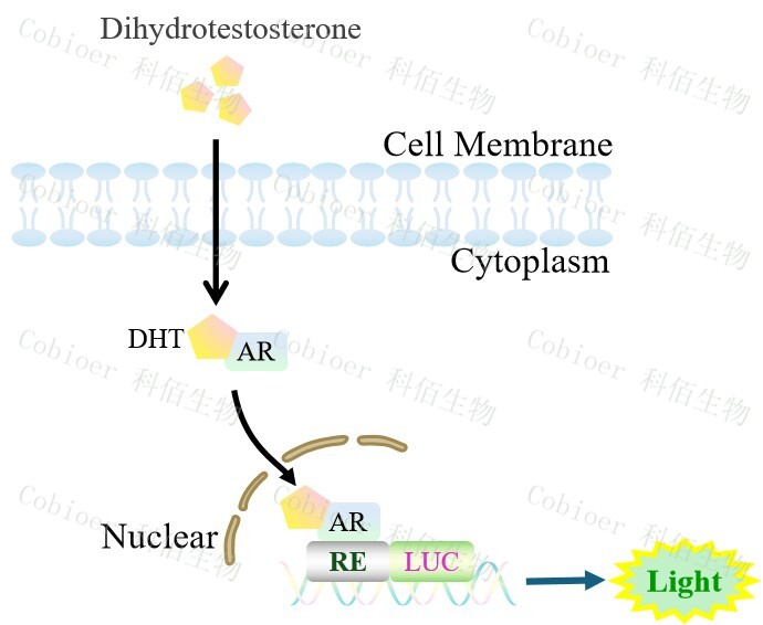 AR Reporter LNCAP Cell(DHT high sensitive)藥靶細(xì)胞,在由調(diào)控因子調(diào) 控并表達(dá)報告基因的重組細(xì)胞上,穩(wěn)定表達(dá)人 AR。雄激素的代謝產(chǎn)物 DHT(雙氫睪酮) 會與細(xì)胞上的 AR 結(jié)合,激活 AR 信號通路,原理見下圖所示。