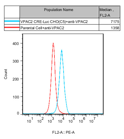 VPAC2 CRE-Luc CHO 報(bào)告基因藥靶模型很好的模擬了體內(nèi) VPAC2 的信號(hào)轉(zhuǎn)導(dǎo)過程, 原理見下圖所示。![]() Figure 1. VPAC2 CRE-Luc CHO 細(xì)胞模型原理圖 |