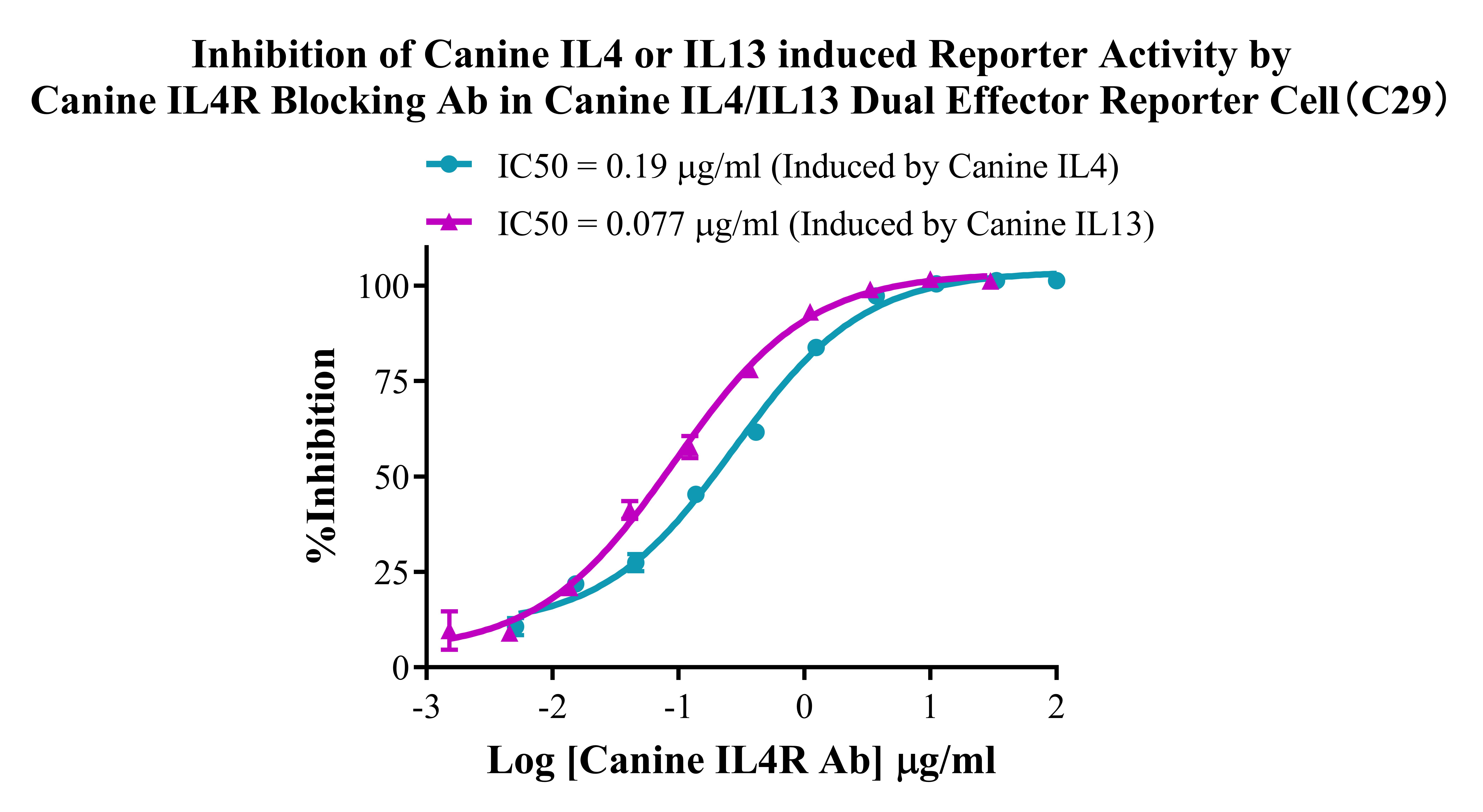 ![]() Figure 3. Dose Response of Recombinant Canine 1L13 in Canine IL4/IL13 Dual Effector Reporter Cell(C29). ![]() Figure 4. Inhibition of Canine IL4 or IL3 induced Reporter Activity by Canine IL4R Blocking Ab in Canine IL4/IL13 Dual Effector Reporter Cell (C29). |