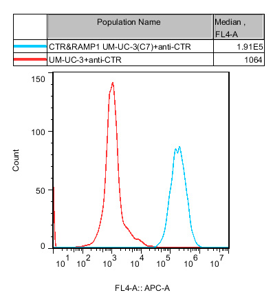 CTR&RAMP1 UM-UC-3 細(xì)胞藥靶模型很好的模擬了體內(nèi) CTR&RAMP1 的信號(hào)轉(zhuǎn)導(dǎo)過(guò)程,原理見下圖所示。![]() Figure 1. CTR&RAMP1 UM-UC-3 細(xì)胞模型原理圖 |