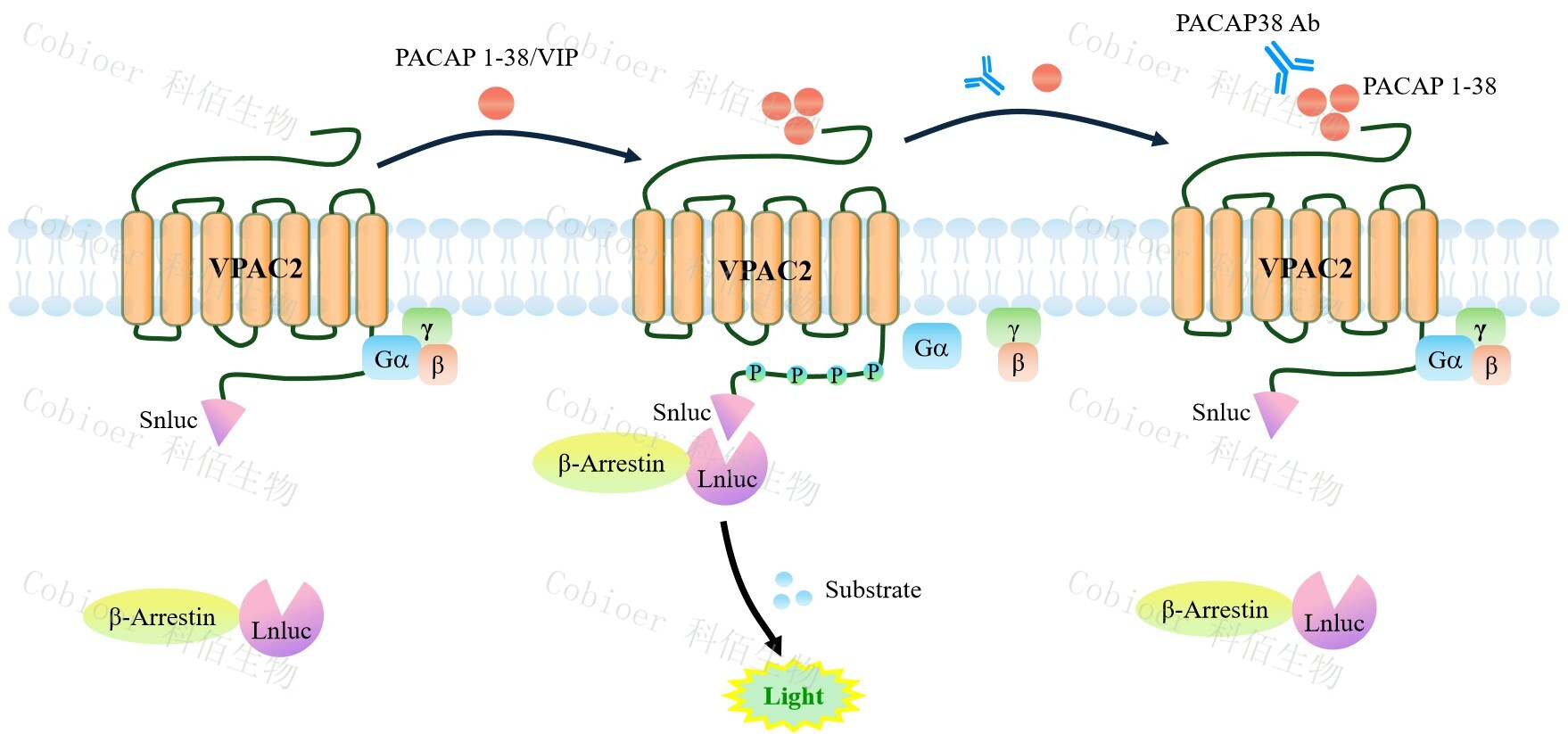 VPAC2 β-Arrestin CHO 報(bào)告基因藥靶模型很好的模擬了體內(nèi) VPAC2/β-Arrestin 的信號(hào)轉(zhuǎn)導(dǎo)過程,原理見下圖所示。當(dāng)缺乏配體刺激時(shí),β-Arrestin 不與 VPAC2 結(jié)合,融合β- Arrestin 的熒光素酶處于失活構(gòu)象,當(dāng) VPAC2 遭遇配體刺激時(shí),融合熒光素酶報(bào)告基因的 β-Arrestin 被招募,使熒光素酶報(bào)告基因處于激活狀態(tài),加入其底物后發(fā)光信號(hào)增強(qiáng)。![]() Figure 1. VPAC2 β-Arrestin CHO 細(xì)胞模型原理圖 |