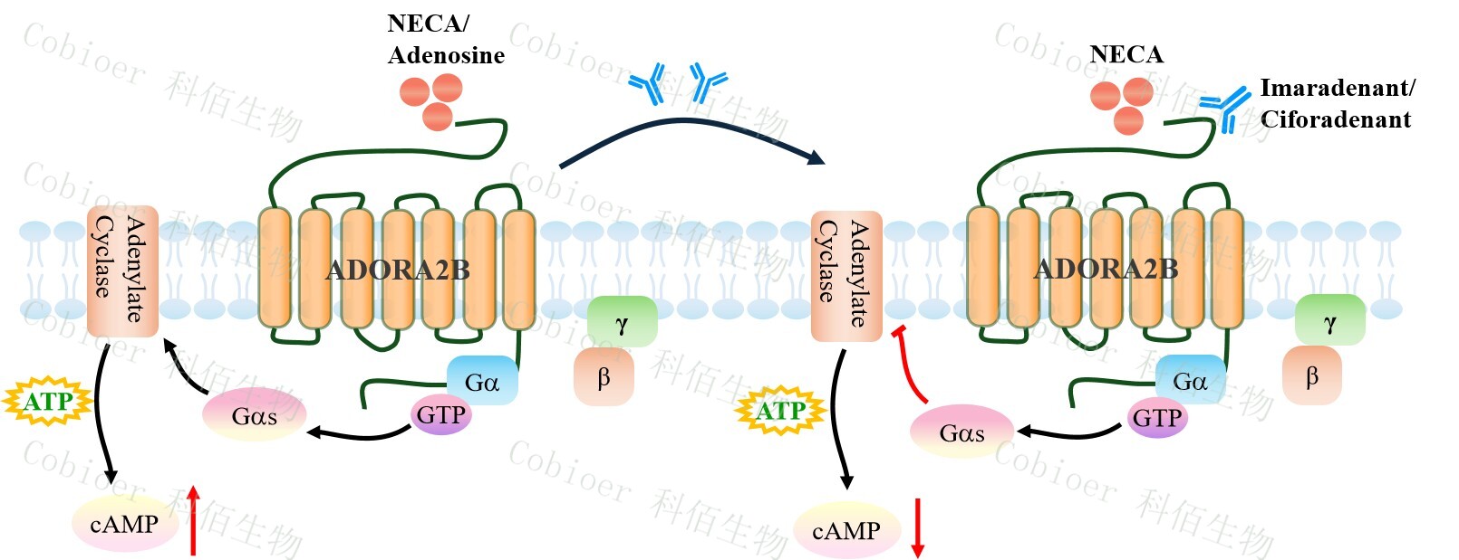 cAMP 在 G 蛋白偶聯(lián)受體(GPCR)信號轉導中是一種關鍵的第二信使。當配體結合 到 GPCR,構象發(fā)生變化,激活受體接著激活 G 蛋白,Gs 的激活導致腺苷酸環(huán)化酶調控 cAMP 的升高。 ADORA2B Gα15 CHO 細胞藥靶模型很好的模擬了體內 ADORA2B 的信號轉導過程,原理見下圖所示。