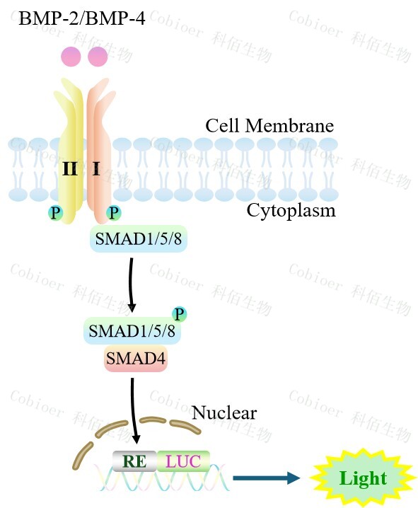 BMP Effector Reporter Cell 報(bào)告基因藥靶模型很好的模擬了體內(nèi) BMP 的信號(hào)轉(zhuǎn)導(dǎo)過程, 原理見下圖所示。![]() Figure 1. BMP Effector Reporter Cell 細(xì)胞模型原理圖 |