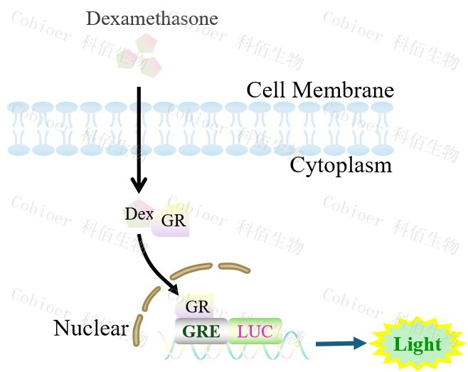 GRE-Luc HEK293 報(bào)告基因細(xì)胞,是由 GRE 調(diào)控并表達(dá) Luc 熒光素酶 報(bào)告基因的 HEK293 細(xì)胞。Dexamethasone (Hexadecadrol,地塞米松)是糖皮質(zhì)激素受體 (Glucocorticoid Receptor)激動(dòng)劑、凋亡誘導(dǎo)劑,原理見(jiàn)下圖所示。![]() Figure 1. GRE-Luc HEK293 細(xì)胞原理示意圖 |