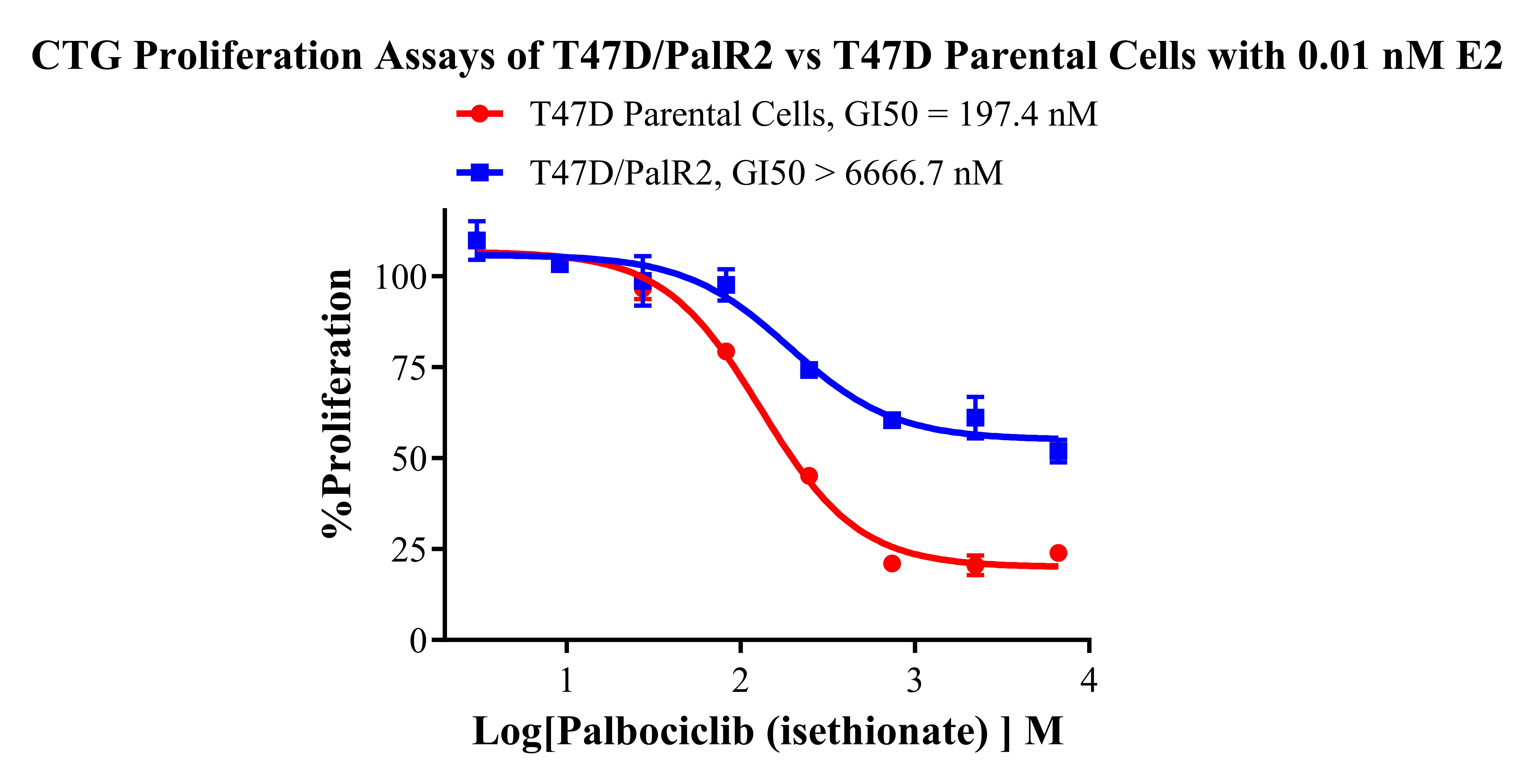 Figure 1. CTG Proliferation Assays of T47D/PalR2 vs T47D Parental Cells with 0.01 nM E2. |