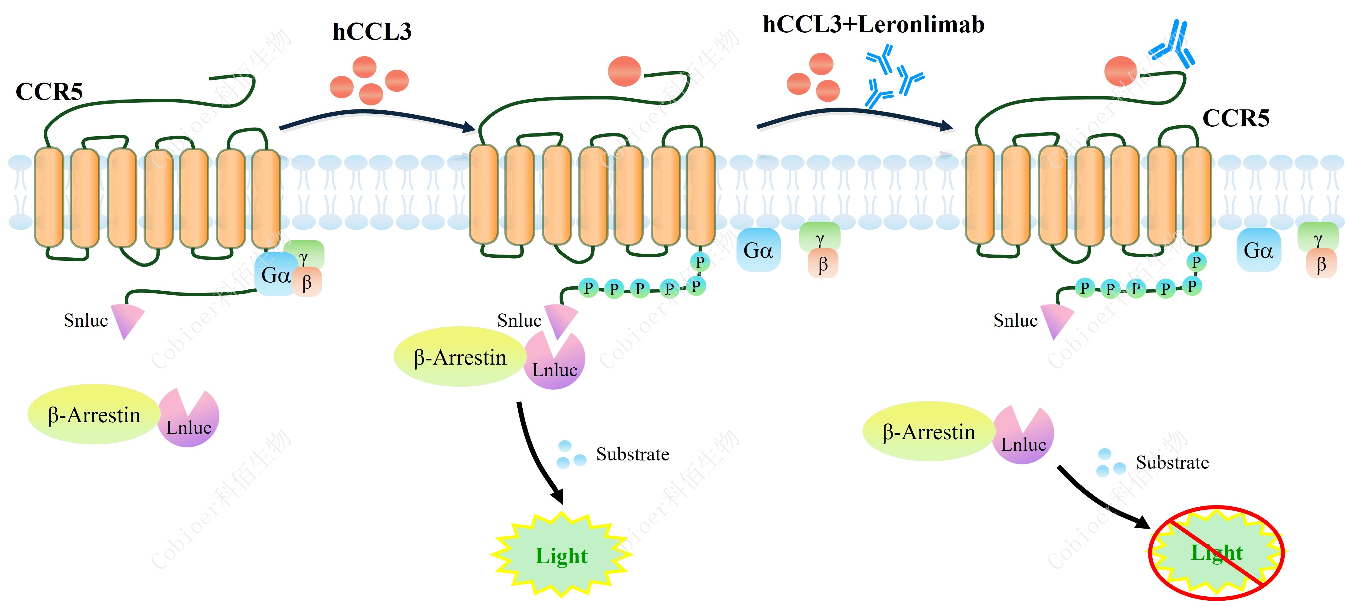 報告基因細(xì)胞模型可以很好的反映分子作用機(jī)制,同時具備更小的變異性和更好的可 操作性,已被中檢院及藥企廣泛應(yīng)用于抗體藥物生物活性的檢定,對于藥物研發(fā)、質(zhì)量控 制、批次放行都有重要意義。 CCR5 β-Arrestin CHO 報告基因藥靶模型很好的模擬了體內(nèi) CCR5/β-Arrestin 的信號轉(zhuǎn)導(dǎo)過程,原理見下圖所示。![]() Figure 1. CCR5 β-Arrestin CHO 細(xì)胞模型原理圖