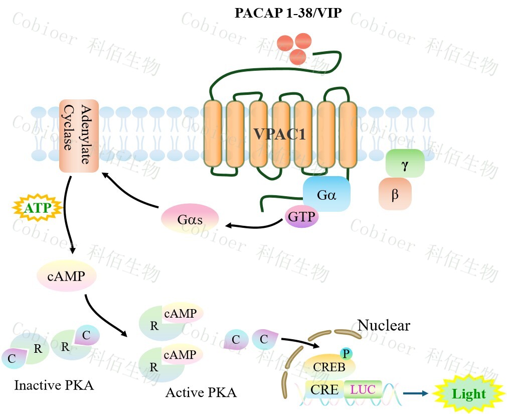 VPAC1 CRE-Luc HEK293 報(bào)告基因藥靶模型很好的模擬了體內(nèi) VPAC1 的信號(hào)轉(zhuǎn)導(dǎo)過(guò)程,原理見(jiàn)下圖所示。![]() Figure 1. VPAC1 CRE-Luc HEK293 細(xì)胞模型原理圖 |