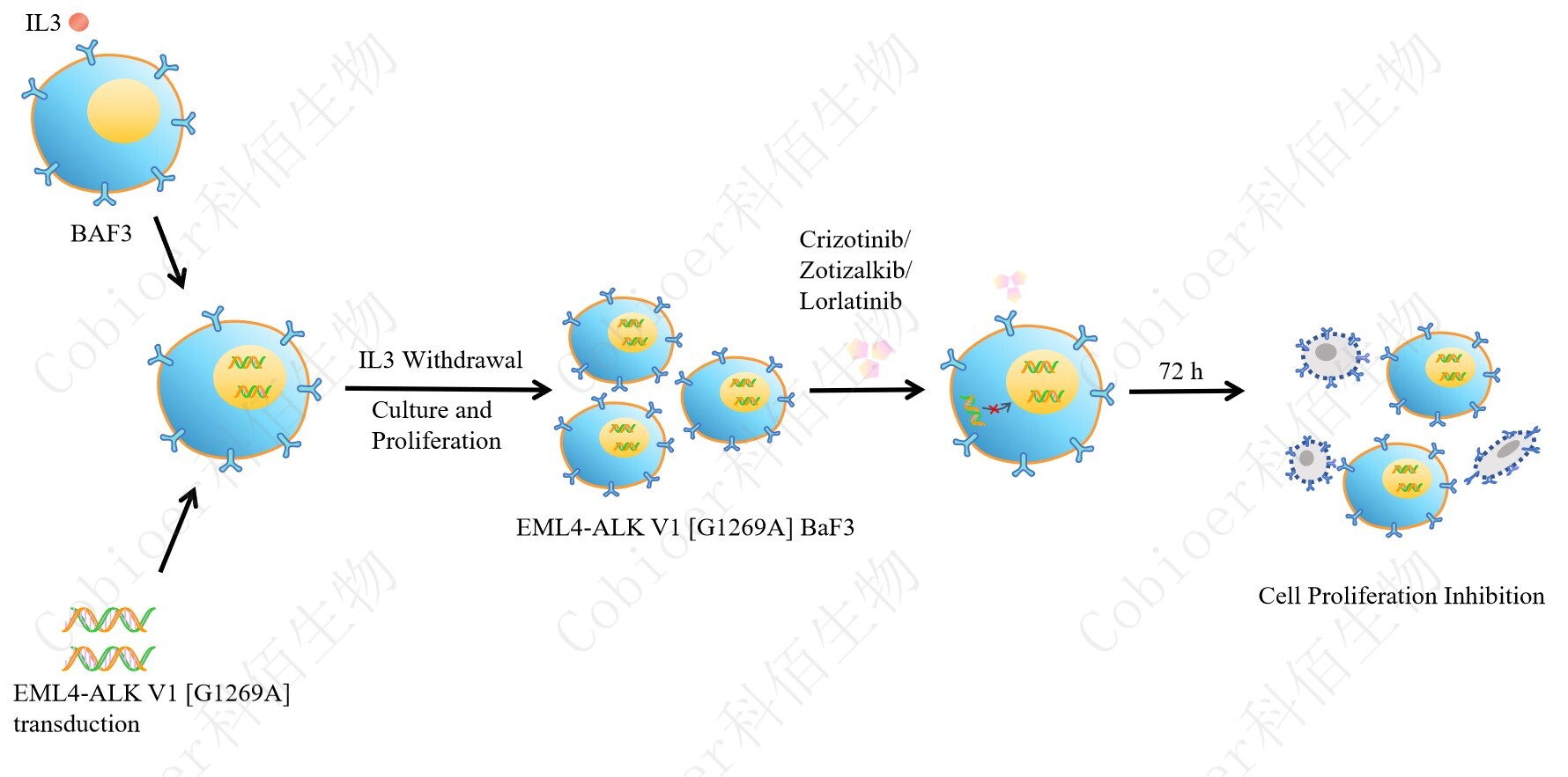 BaF3(小鼠原 B 細(xì)胞)的生長(zhǎng)和增殖需要 IL-3 的維持。通過(guò)引入各種表達(dá)激酶的基因, 能作為 BaF3 的驅(qū)動(dòng)基因,讓 BaF3 不再依賴 IL-3 而增殖,進(jìn)而激酶基因成為 BaF3 增殖依 賴的驅(qū)動(dòng)基因,用于評(píng)估小分子藥物對(duì)激酶的靶向抑制作用,原理及流程見下圖所示。