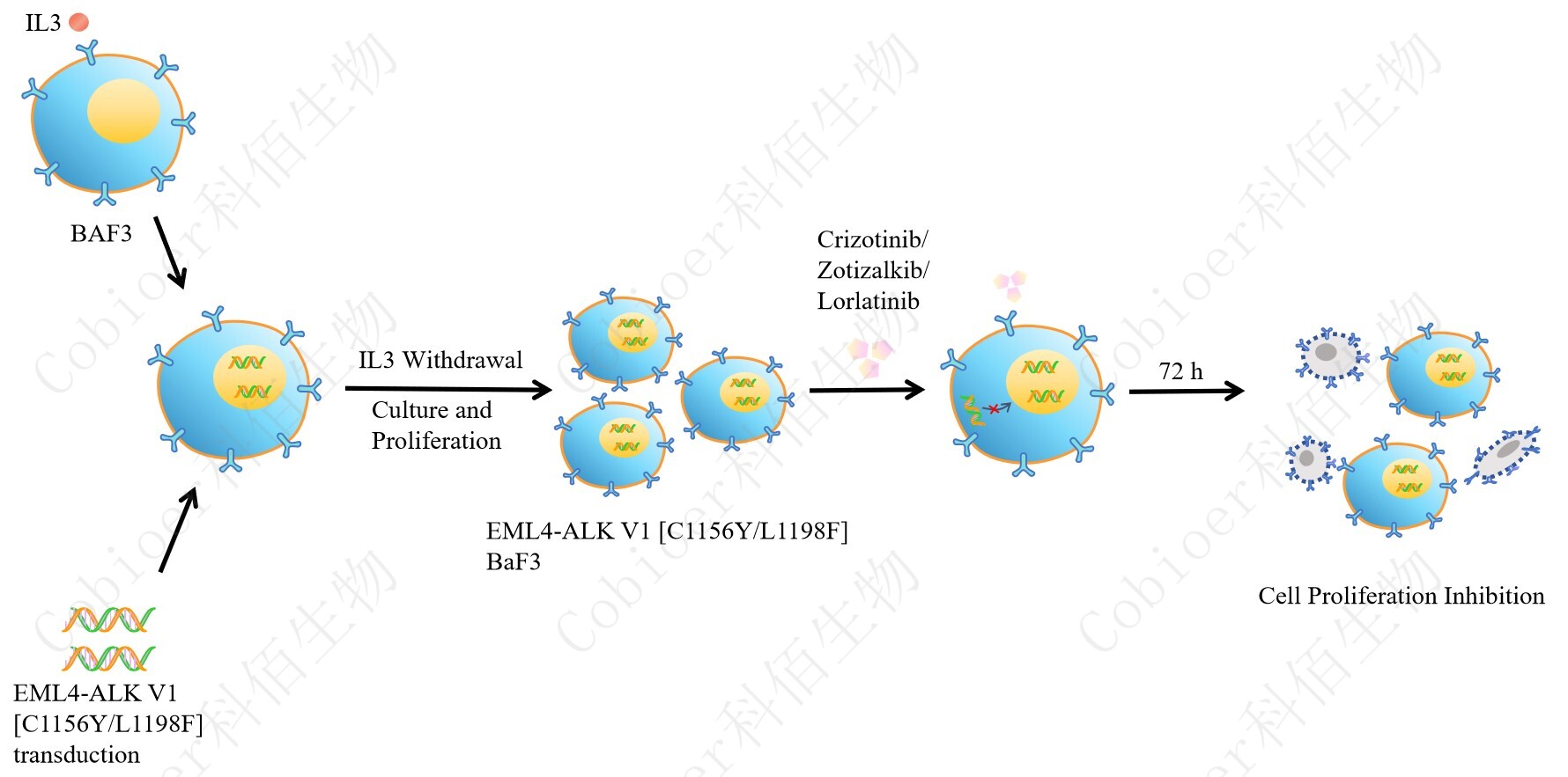 BaF3(小鼠原 B 細(xì)胞)的生長(zhǎng)和增殖需要 IL-3 的維持。通過(guò)引入各種表達(dá)激酶的基因, 能作為 BaF3 的驅(qū)動(dòng)基因,讓 BaF3 不再依賴 IL-3 而增殖,進(jìn)而激酶基因成為 BaF3 增殖依 賴的驅(qū)動(dòng)基因,用于評(píng)估小分子藥物對(duì)激酶的靶向抑制作用,原理及流程見(jiàn)下圖所示。