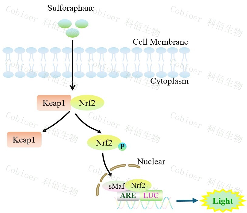 ARE-Luc(Nrf2 Antioxidant Pathway) HEK293 報告基因細(xì)胞,是由 ARE 調(diào)控并表達 Luc 熒光素酶報告基因的 HEK293 細(xì)胞。Sulforaphane 是 Keap1/Nrf2/ARE 的誘 導(dǎo)劑,原理見下圖所示。![]() Figure 1. ARE-Luc(Nrf2 Antioxidant Pathway) HEK293 細(xì)胞模型原理圖