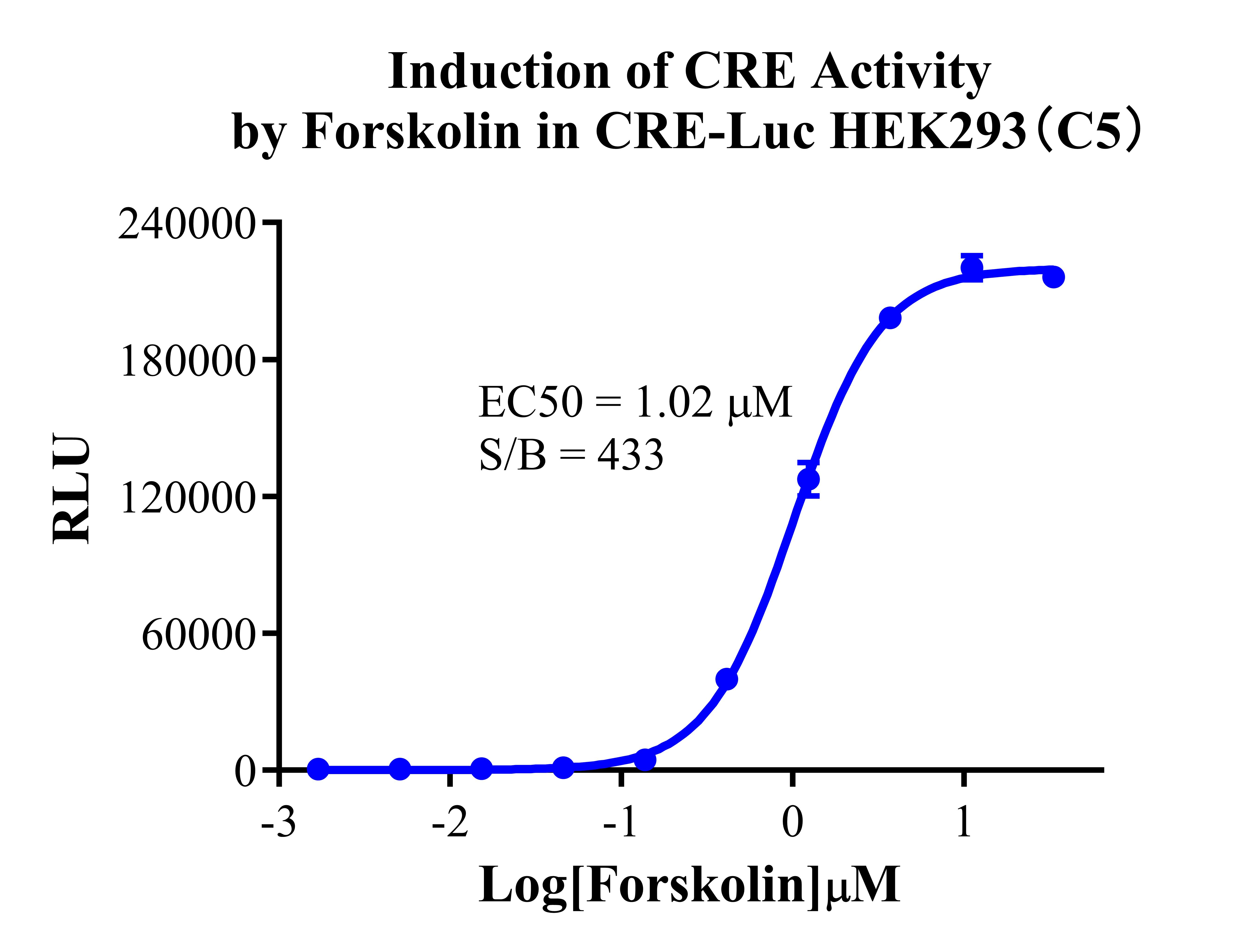 CRE-Luc HEK293 報(bào)告基因細(xì)胞是由 CRE 調(diào)控并表達(dá) Luc 熒光素酶報(bào)告基因的 HEK293 細(xì)胞。Forskolin 是天然存在的直接腺苷酸環(huán)化酶(AC)/cAMP/CREB 的 激活劑,原理見(jiàn)下圖所示。![]() Figure 1:CRE-Luc HEK293 原理示意圖 |
