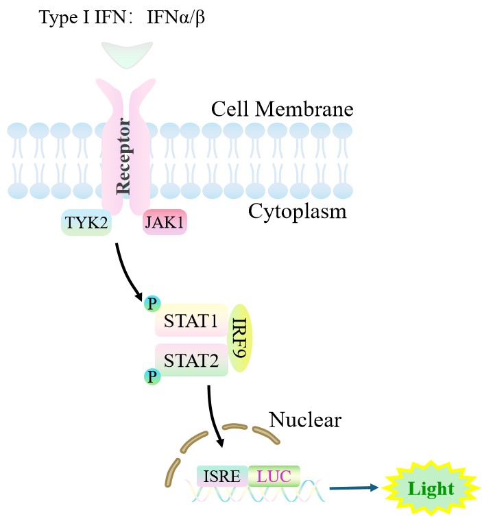 ISRE-Luc THP-1 報(bào)告基因細(xì)胞是由 ISRE 調(diào)控并表達(dá) Luc 熒光素酶報(bào) 告基因的 THP-1 細(xì)胞。IFN 與受體結(jié)合,激活 ISRE 的原理見下圖所示。