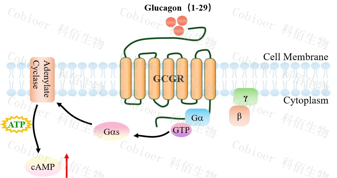| 胰高血糖素是一種胰腺肽激素,作為胰島素的反調(diào)節(jié)激素,刺激葡萄糖通過肝臟釋放, 維持葡萄糖穩(wěn)態(tài)。GCGR 是一種 B 類 GPCR,最初被描述為與腺苷酸環(huán)化酶功能相連的胰 高血糖素結(jié)合體。它在維持葡萄糖穩(wěn)態(tài)中起關(guān)鍵作用,因此被認為是治療糖尿病的一個有 價值的靶點。 GCGR 的天然配體是胰高血糖素。胰高血糖素與受體結(jié)合激活 Gs 蛋白,從而激活腺苷 酸環(huán)化酶。GCGR 受體與天然配體胰高血糖素結(jié)合調(diào)節(jié)體內(nèi)葡萄糖穩(wěn)態(tài),是Ⅱ型糖尿病的 重要藥物靶點。 |