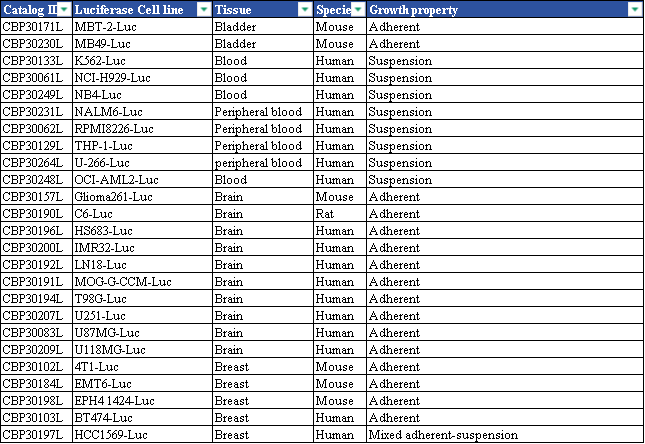 表7. 科佰生物部分現貨示蹤Luc細胞的清單展示