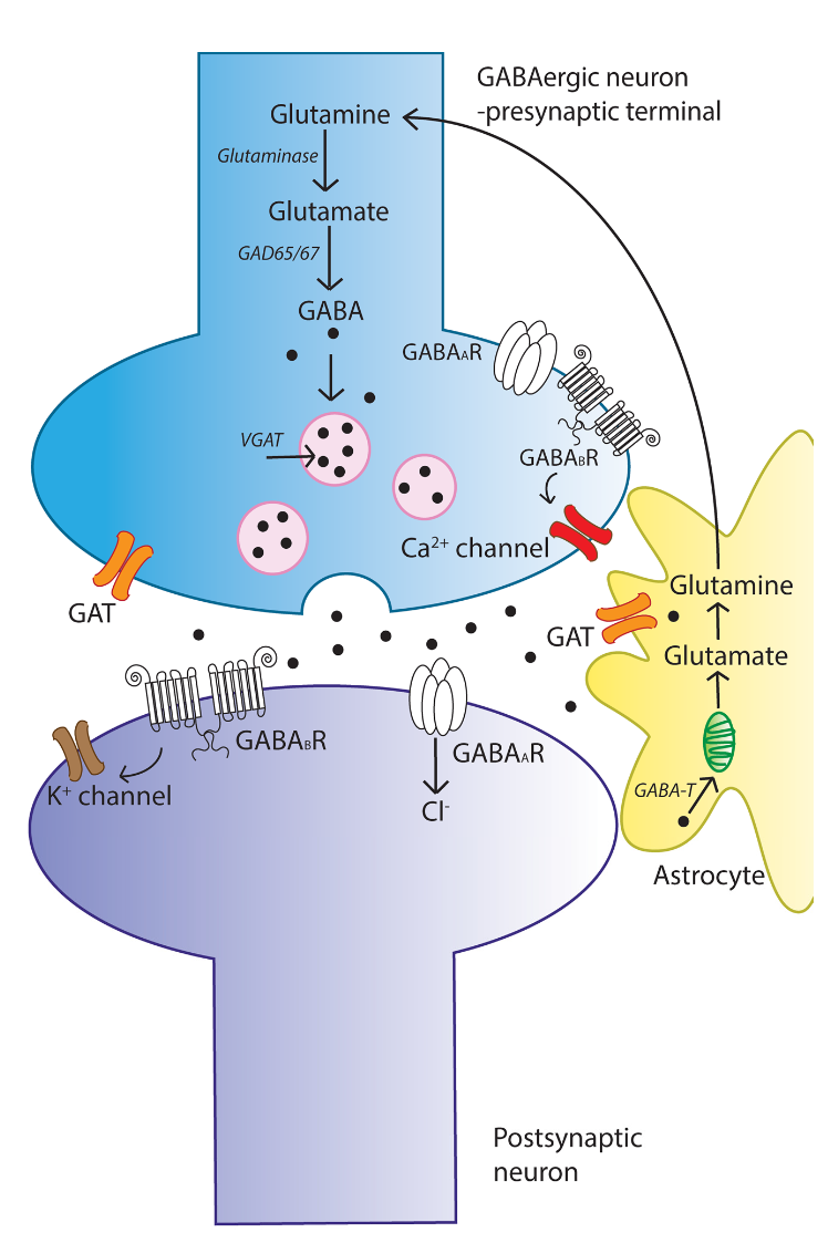 GABA的合成是通過谷氨酸酸脫羧酶(GAD)對L-谷氨酸的α-脫羧作用進行的,并依賴于輔酶吡哆醛-5'-磷酸(維生素B6的一種維生素)。GAD存在兩種主要的亞型:65 kDa亞型(GAD65)和67 kDa亞型(GAD67)。GAD65是哺乳動物大腦中表達的GAD的主要亞型,主要定位于突觸體的軸突末端,容易與質(zhì)膜相互作用,而GAD67則更廣泛地分布于細(xì)胞的細(xì)胞質(zhì)中。兩種GAD亞型的差異分布與細(xì)胞內(nèi)兩種GABA的存在相吻合,一種存在于囊泡中,另一種存在于細(xì)胞質(zhì)中,它們通過不同的機制釋放。GABA通過囊泡GABA轉(zhuǎn)運蛋白(vGAT)的作用被募集到突觸囊泡中。在膜去極化后,GABA被釋放到突觸中,并可與突觸后膜上的嗜離子性GABA受體(GABAAR)或代謝性GABB受體(GABABR)結(jié)合,從而抑制突觸后神經(jīng)元。釋放的GABA通過膜結(jié)合的GABA轉(zhuǎn)運體(GATs)從突觸中清除,在星形膠質(zhì)細(xì)胞中,GABA被循環(huán)進入突觸囊泡或被線粒體吸收,在線粒體中被GABA轉(zhuǎn)氨酶(GABA- t)代謝為谷氨酰胺供神經(jīng)元攝取。