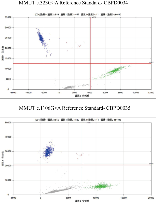 圖 2. Results of dPCR with MMUT c.323G>A Reference Standard and MMUT c.1106G>A Reference Standard.