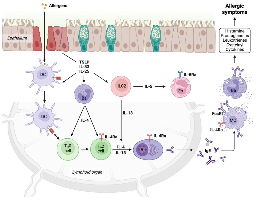 過敏的病因與Ⅱ型炎癥反應(yīng)密切相關(guān),會(huì)導(dǎo)致過敏原特異性免疫球蛋白E(IgE)的產(chǎn)生,這是許多過敏性疾病的關(guān)鍵驅(qū)動(dòng)因素。在高水平上,初始的過敏原暴露會(huì)破壞上皮的完整性,通過包括IL-25、IL-33和TSLP在內(nèi)的細(xì)胞因子觸發(fā)局部炎癥,這些炎癥激活Ⅱ型先天淋巴樣細(xì)胞以及其他免疫細(xì)胞來分泌Ⅱ型細(xì)胞因子IL-4、IL-5和IL-13,促進(jìn)Th2細(xì)胞的發(fā)育和嗜酸性粒細(xì)胞的招募。Th2細(xì)胞依賴的B細(xì)胞激活促進(jìn)了過敏原特異性IgE的產(chǎn)生,IgE穩(wěn)定地與嗜堿性細(xì)胞和肥大細(xì)胞表面的Fc段含高親和力受體(FcεRI)結(jié)合。在過敏原再次暴露后,這些細(xì)胞迅速脫粒導(dǎo)致過敏癥狀。