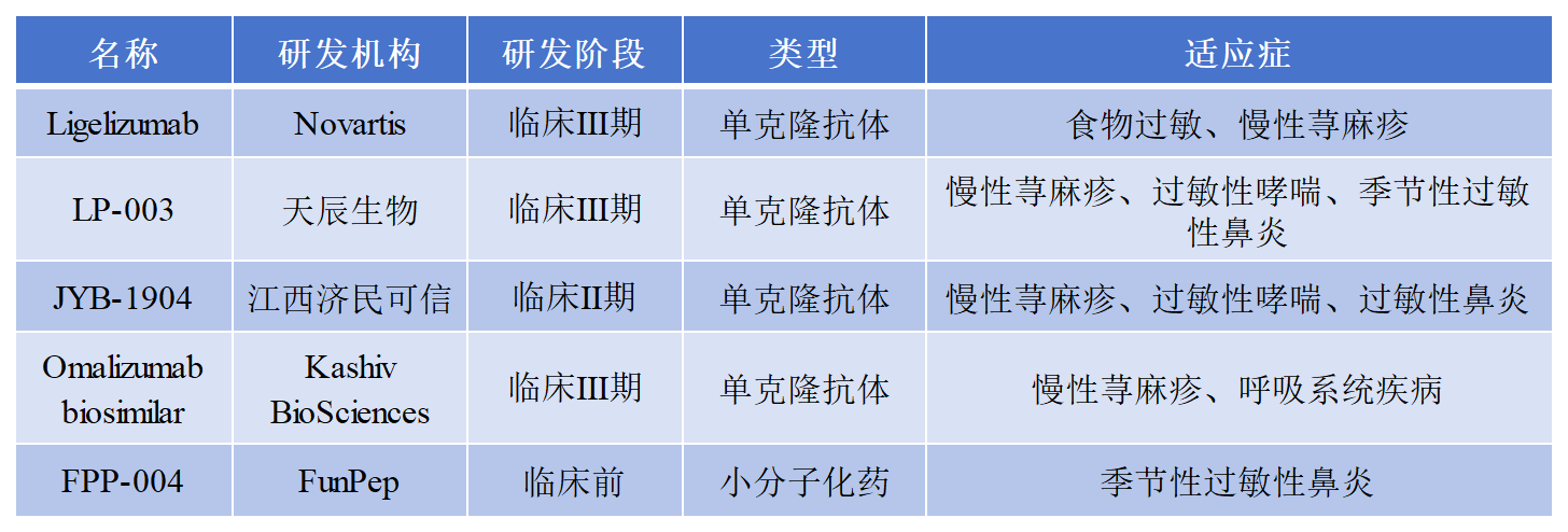 2025年3月2日,中國(guó)創(chuàng)新型生物制藥企業(yè)天辰生物醫(yī)藥(蘇州)有限公司公布了其自主研發(fā)的新一代抗IgE抗體LP-003治療慢性蕁麻疹的II期臨床中期數(shù)據(jù)。結(jié)果顯示,LP-003在關(guān)鍵療效指標(biāo)上優(yōu)于現(xiàn)有抗IgE療法奧馬珠單抗,且展現(xiàn)出長(zhǎng)效優(yōu)勢(shì),或?qū)⒊蔀槿蚩笽gE治療領(lǐng)域的顛覆性藥物。據(jù)報(bào)道,Ligelizumab是諾華通過親和力改造的靶向Ig E的全人源IgG1k單抗,與奧馬珠單抗同為第一代IgE抗體,對(duì)IgE/FcεRI信號(hào)傳導(dǎo)阻滯明顯增強(qiáng)。JYB1904是濟(jì)民可信自主研發(fā)的靶向IgE重組人源化單克隆抗體創(chuàng)新藥,研究結(jié)果顯示其親和力更高,人源化程度更高,具有更優(yōu)的穩(wěn)定性。