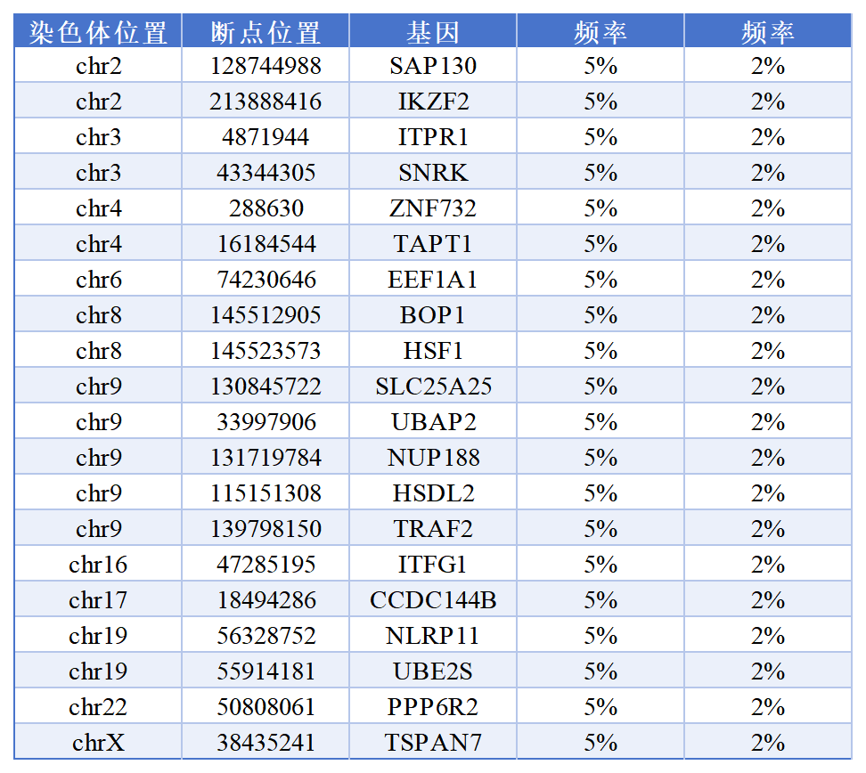 目前檢測ISA的方法有LM-PCR、NGS、單細胞測序等,為了保證檢測的準確性,科佰生物開發(fā)了一系列慢病毒整合位點標準品供檢測機構使用,作為品質衡量的標尺對檢測能力進行判別。在前文 慢病毒整合位點標準品強勢來襲一文中,已對單克隆多插入位點、單克隆單插入位點、性染色體插入位點 做了產品的說明及數(shù)據(jù)展示。近期科佰推出了5% 2% 整合頻率的慢病毒多克隆多整合位點參考品,由多個單克隆整合位點產品混合而來,覆蓋20個插入位點,分別來自11個不同染色體上的20個基因,如下表所示