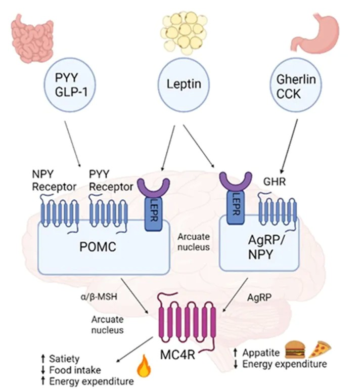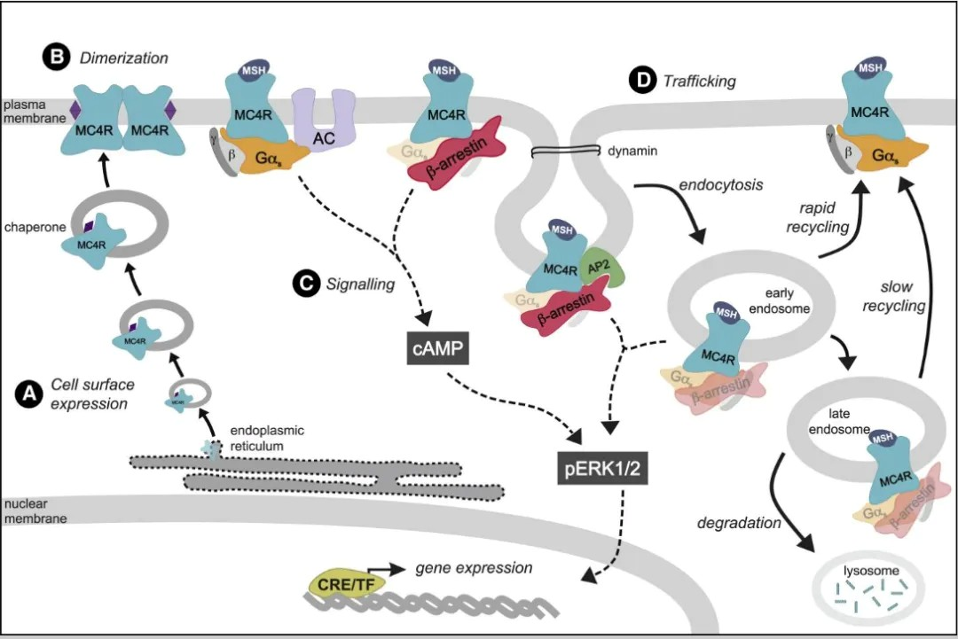 MC4R (黑皮質(zhì)素4受體) 是黑皮質(zhì)素受體家族成員之一,其家族屬于視紫紅質(zhì)樣A類GPCR,成員還包括:MC1R、MC2R、MC3R和MC5R。黑皮質(zhì)素受體 (MC1R-MC5R) 位于多種細胞類型上,并遍布大多數(shù)身體系統(tǒng)。MC4R是中樞黑皮質(zhì)素系統(tǒng)的重要組成部分,主要在下丘腦室旁核(PVH)中表達,是一種A類GPCR。在高能量平衡狀態(tài)下,阿片黑皮質(zhì)素原 (POMC) 神經(jīng)元釋放多肽MC4R激動劑-α-黑素細胞刺激激素(α-MSH)。α- MSH與MC4R結(jié)合會激活MC4R信號傳導,抑制食欲和食物攝入。在低能量平衡狀態(tài)下,下丘腦室旁核中釋放AgRP (agouti-related peptide)。AgRP作為MC4R與α- MSH結(jié)合的競爭性拮抗劑,也是MC4R反向激動劑,抑制MC4R信號傳導。