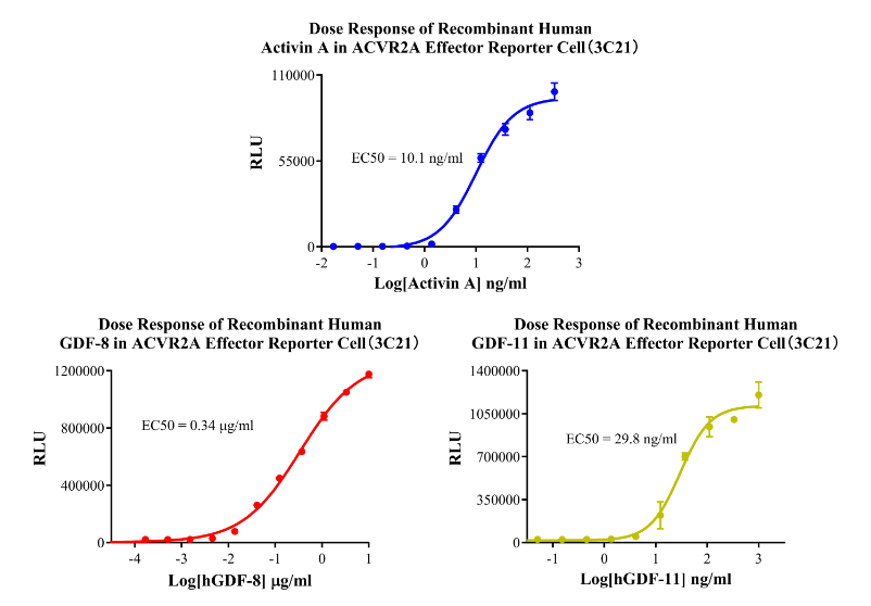 Figure 13.Dose Response of Recombinant Human Activin A  in ACVR2B Effector Cell(2C8).Dose Response of Recombinant Human GDF-8 in ACVR2B Effector Reporter Cell(2C8).Dose Response of Recombinant Human GDF-11 in ACVR2B Effector Reporter Cell (2C8).